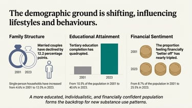 Educational Attainment: The quadrupling of tertiary education rates has created a more "experimental" and "educated" consumer base that is more likely to adopt new trends like vaping or legalized cannabis.