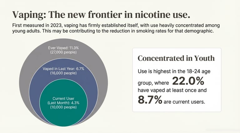 However, this isn't a simple story of cessation. It is a "Great Substitution." As traditional tobacco declined, vaping emerged as a significant new entrant, already capturing 4.3% of the market in its first year of measurement. This shift reflects a move toward "optimized" consumption users are seeking the nicotine hit without the traditional social stigma or the odor of combustible tobacco.